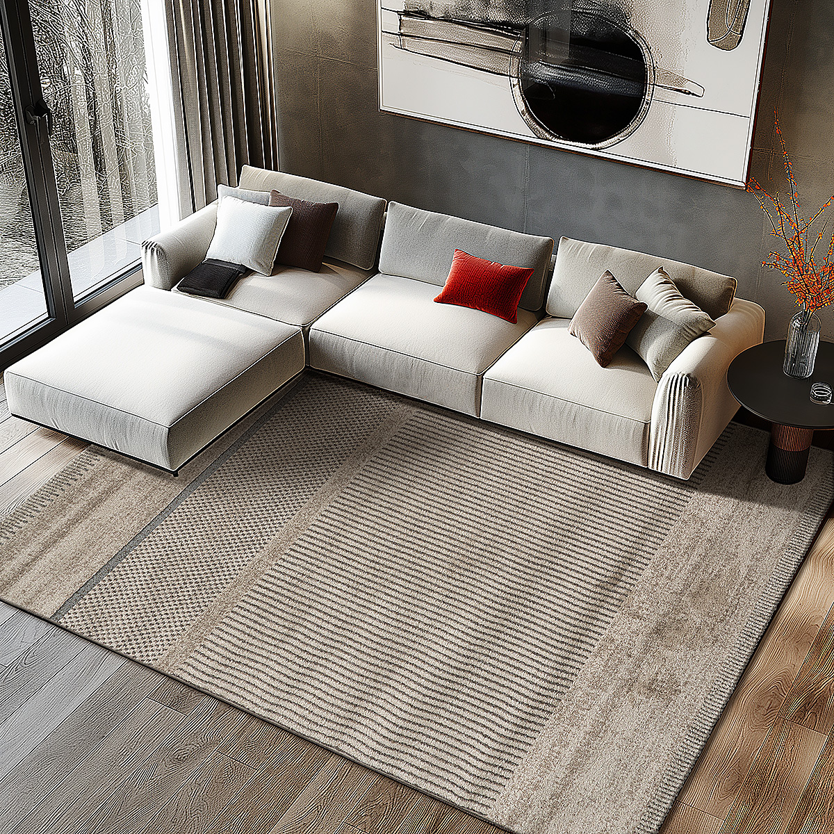 Οι γήινες αποχρώσεις, όπως το μπέζ, προσφέρουν μια ουδέτερη βάση που μπορεί να συνδυαστεί εύκολα με διάφορα χρώματα και υφάσματα, ενώ το μοντέρνο σχέδιο προσθέτει μια σύγχρονη αίσθηση χωρίς να είναι υπερβολικό.