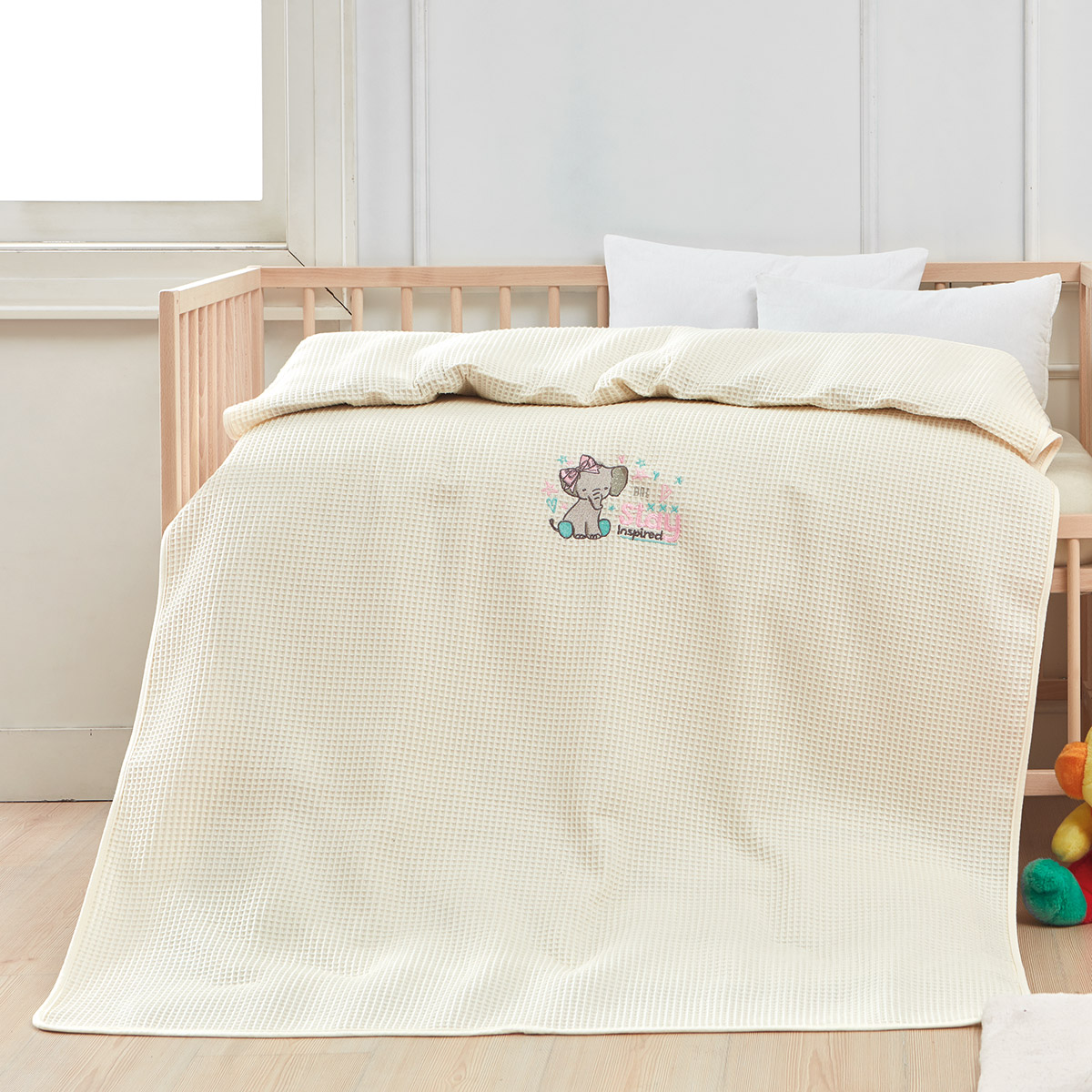 Κουβέρτα πικέ με παιδικό κέντημα 100×150. Η ποιότητά του είναι cotton 100%.